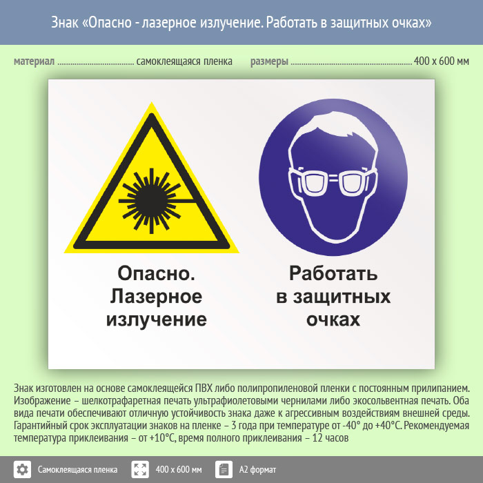 Знак «Опасно - лазерное излучение. Работать в защитных очках», КЗ-38 (пленка, 600х400 мм) в Сургуте купить