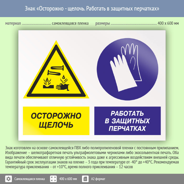 Знак «Осторожно - щелочь. Работать в защитных перчатках», КЗ-60 (пленка, 600х400 мм) в Сургуте купить