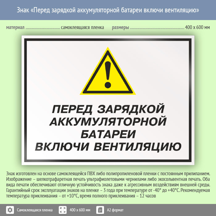 Знак «Перед зарядкой аккумуляторной батареи включи вентиляцию», КЗ-63 (пленка, 600х400 мм) в Сургуте купить