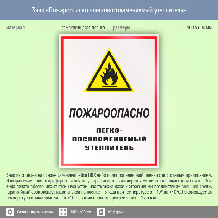 Знак «Пожароопасно - легковоспламеняемый утеплитель», КЗ-68 (пленка, 400х600 мм) в Сургуте купить