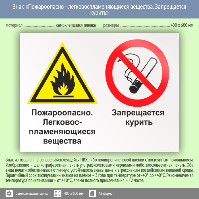 Знак «Пожароопасно - легковоспламеняющиеся вещества. Запрещается курить», КЗ-69 (пленка, 600х400 мм) в Сургуте купить