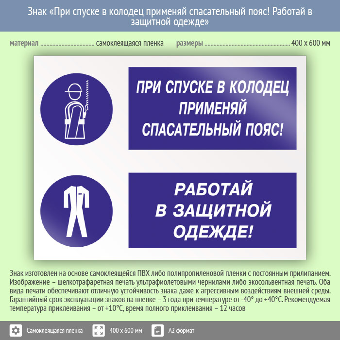 Знак «При спуске в колодец применяй спасательный пояс! Работай в защитной одежде», КЗ-76 (пленка, 600х400 мм) в Сургуте купить