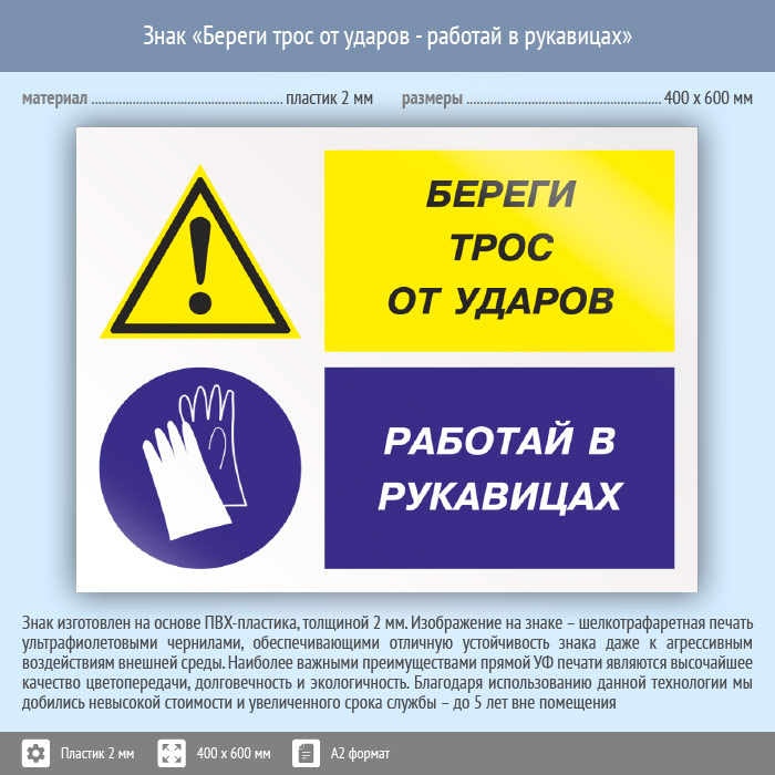 Знак «Береги трос от ударов - работай в рукавицах», КЗ-03 (пластик, 600х400 мм) в Сургуте купить