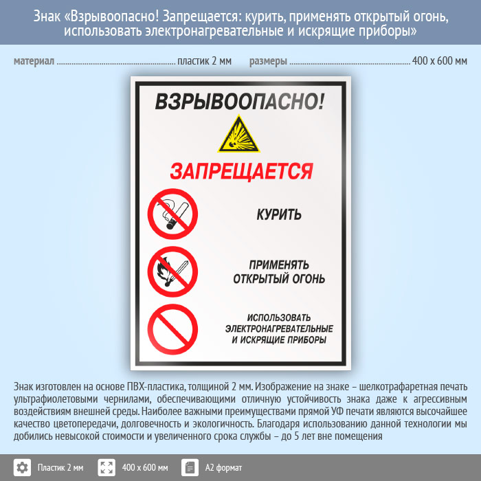Знак «Взрывоопасно! Запрещается: курить, применять открытый огонь, использовать электронагревательные и искрящие приборы», КЗ-10 (пластик, 400х600 мм) в Сургуте купить
