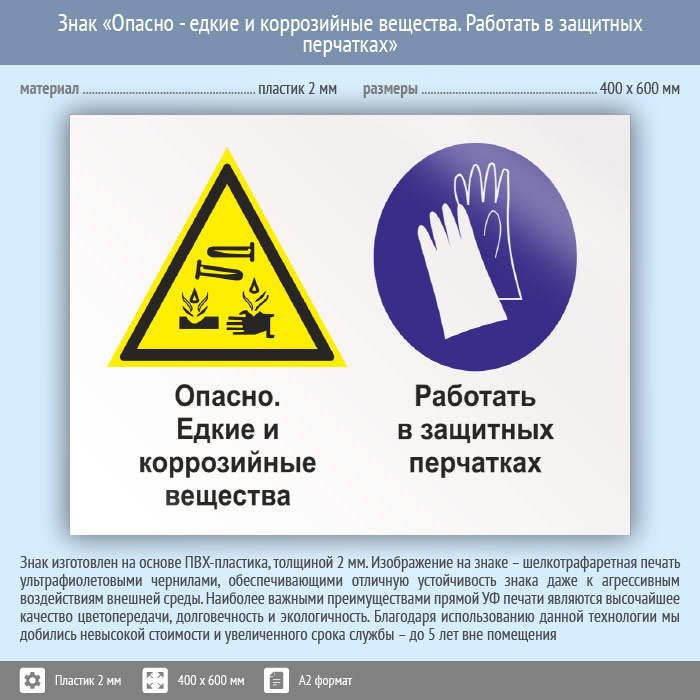 Знак «Опасно - едкие и коррозийные вещества. Работать в защитных перчатках», КЗ-36 (пластик, 600х400 мм) в Сургуте купить