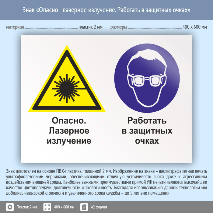 Знак «Опасно - лазерное излучение. Работать в защитных очках», КЗ-38 (пластик, 600х400 мм) в Сургуте купить