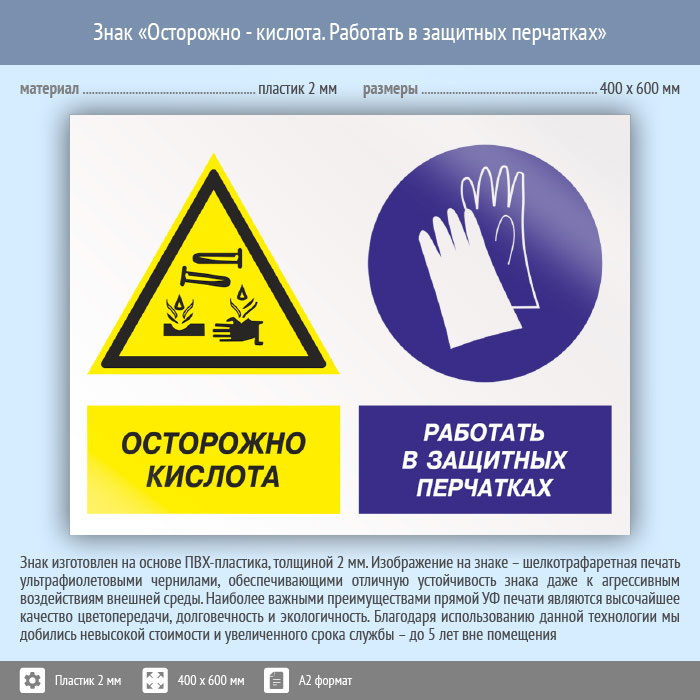 Знак «Осторожно - кислота. Работать в защитных перчатках», КЗ-56 (пластик, 600х400 мм) в Сургуте купить