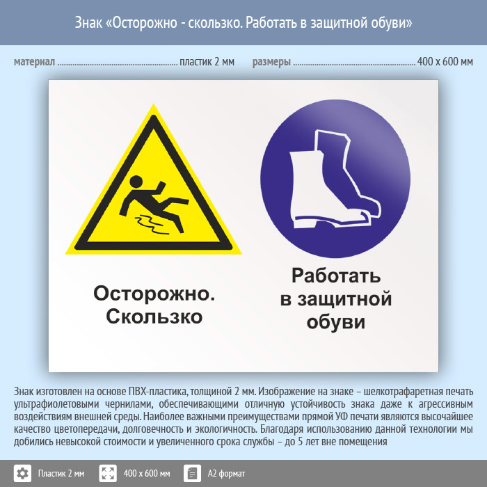 Знак «Осторожно - скользко. Работать в защитной обуви», КЗ-57 (пластик, 600х400 мм) в Сургуте купить