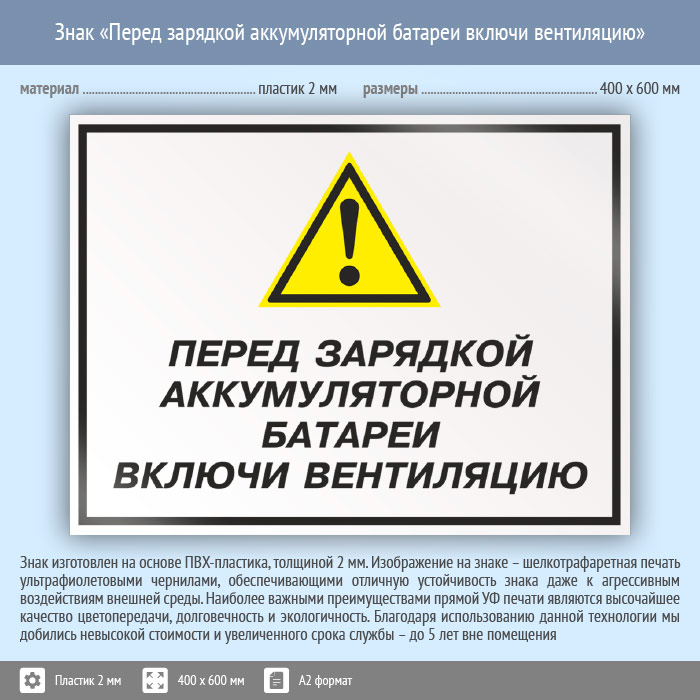 Знак «Перед зарядкой аккумуляторной батареи включи вентиляцию», КЗ-63 (пластик, 600х400 мм) в Сургуте купить