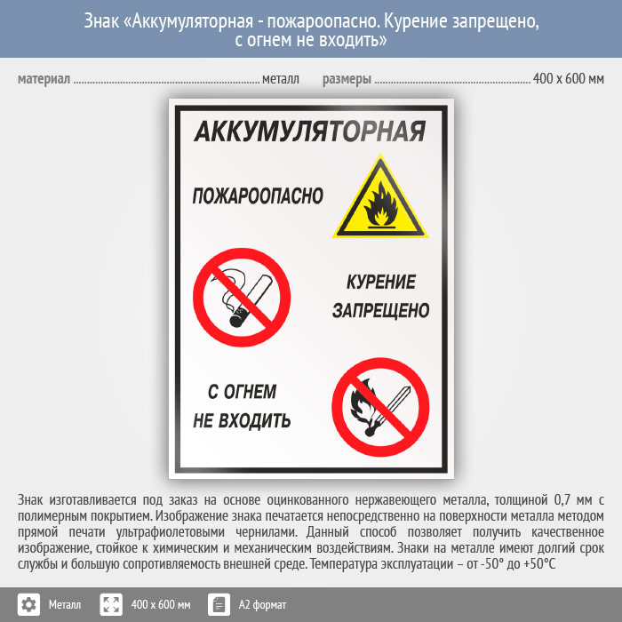 Знак «Аккумуляторная - пожароопасно. Курение запрещено, с огнем не входить», КЗ-01 (металл, 400х600 мм) в Сургуте купить