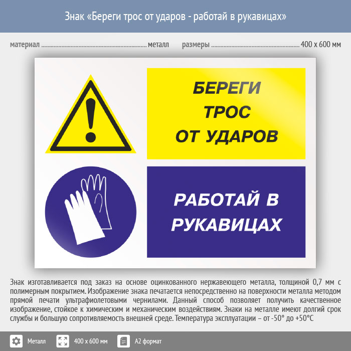 Знак «Береги трос от ударов - работай в рукавицах», КЗ-03 (металл, 600х400 мм) в Сургуте купить