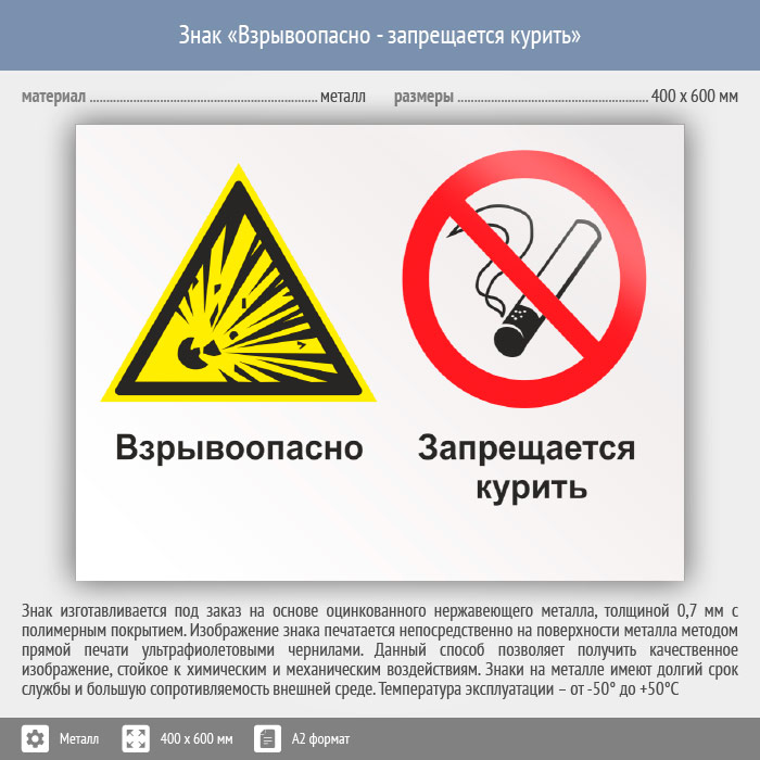 Знак «Взрывоопасно - запрещается курить», КЗ-06 (металл, 600х400 мм) в Сургуте купить