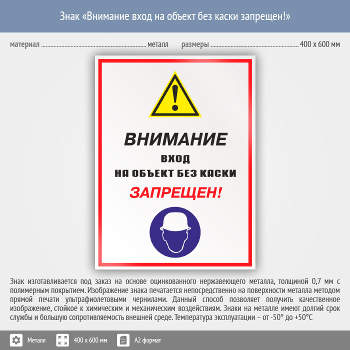 Знак «Внимание вход на объект без каски запрещен!», КЗ-13 (металл, 400х600 мм) в Сургуте купить