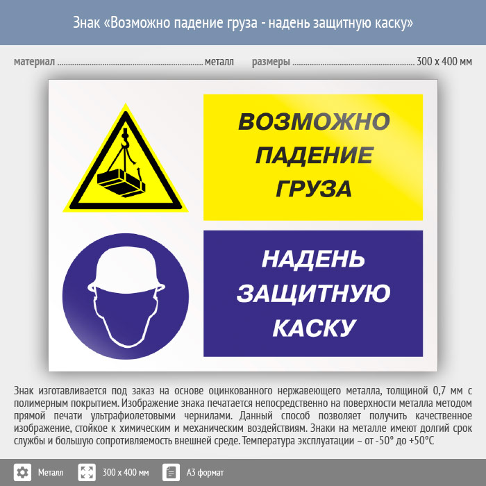 Знак «Возможно падение груза - надень защитную каску», КЗ-17 (металл, 400х300 мм) в Сургуте купить