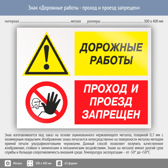 Знак «Дорожные работы - проход и проезд запрещен», КЗ-20 (металл, 400х300 мм) в Сургуте купить
