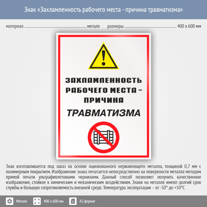 Знак «Захламленность рабочего места - причина травматизма», КЗ-21 (металл, 400х600 мм) в Сургуте купить