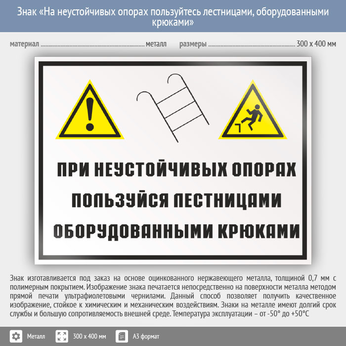 Знак «На неустойчивых опорах пользуйтесь лестницами, оборудованными крюками», КЗ-22 (металл, 400х300 мм) в Сургуте купить