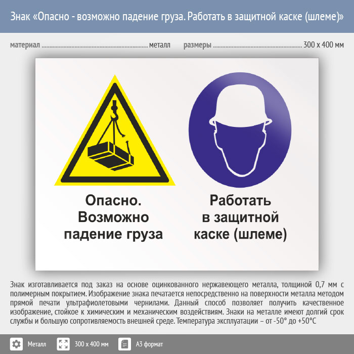 Знак «Опасно - возможно падение груза. Работать в защитной каске (шлеме)», КЗ-34 (металл, 400х300 мм) в Сургуте купить