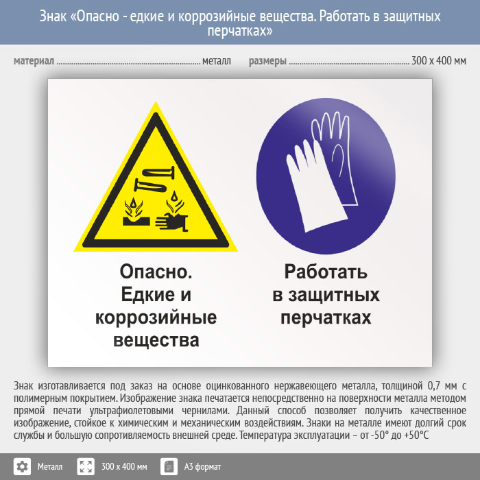Знак «Опасно - едкие и коррозийные вещества. Работать в защитных перчатках», КЗ-36 (металл, 400х300 мм) в Сургуте купить