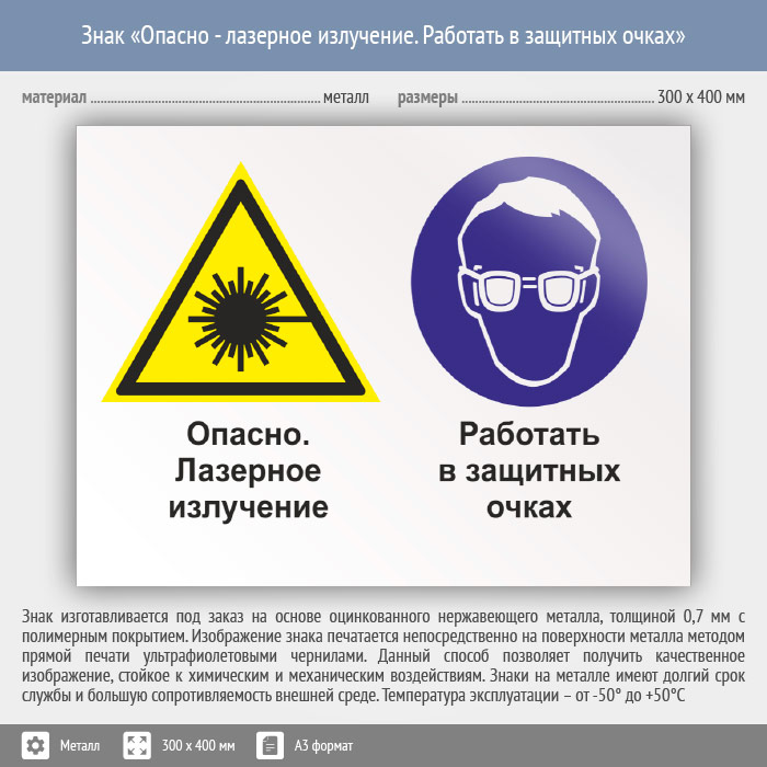Знак «Опасно - лазерное излучение. Работать в защитных очках», КЗ-38 (металл, 400х300 мм) в Сургуте купить