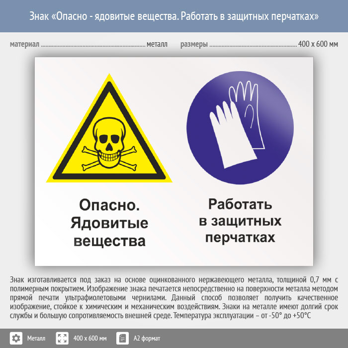 Знак «Опасно - ядовитые вещества. Работать в защитных перчатках», КЗ-43 (металл, 600х400 мм) в Сургуте купить
