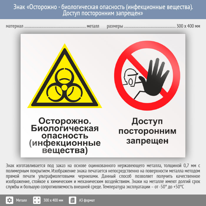 Знак «Осторожно - биологическая опасность (инфекционные вещества). Доступ посторонним запрещен», КЗ-51 (металл, 400х300 мм) в Сургуте купить
