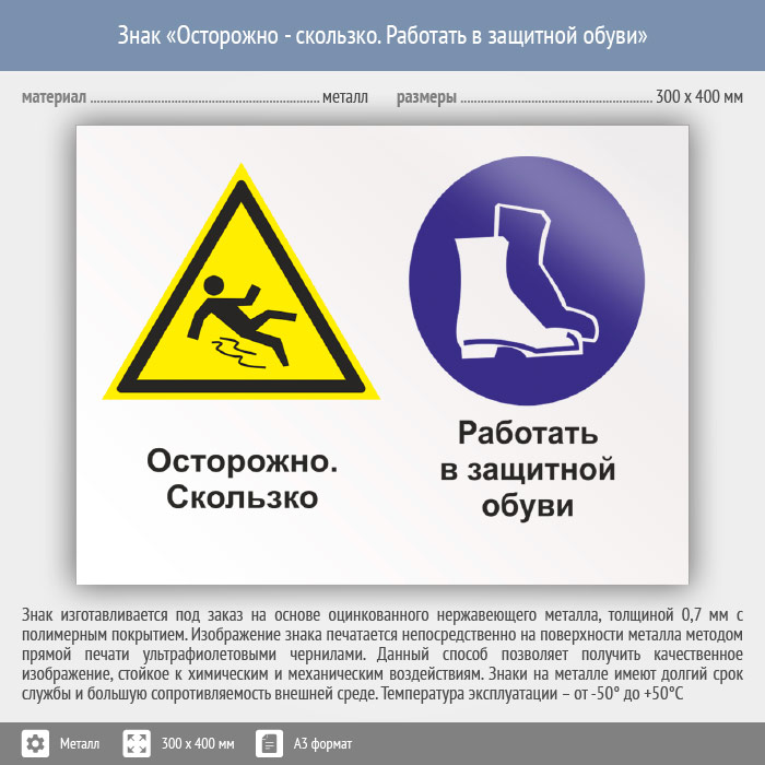 Знак «Осторожно - скользко. Работать в защитной обуви», КЗ-57 (металл, 400х300 мм) в Сургуте купить