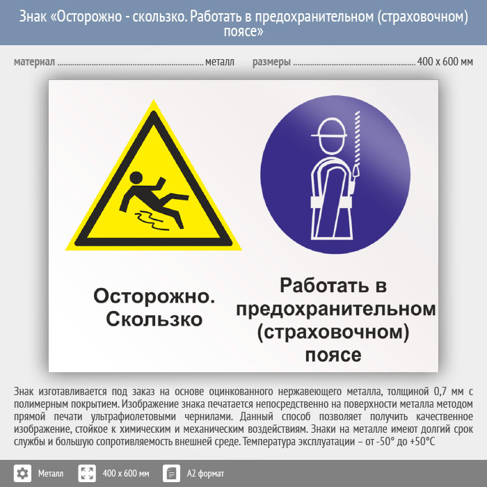 Знак «Осторожно - скользко. Работать в предохранительном (страховочном) поясе», КЗ-58 (металл, 600х400 мм) в Сургуте купить