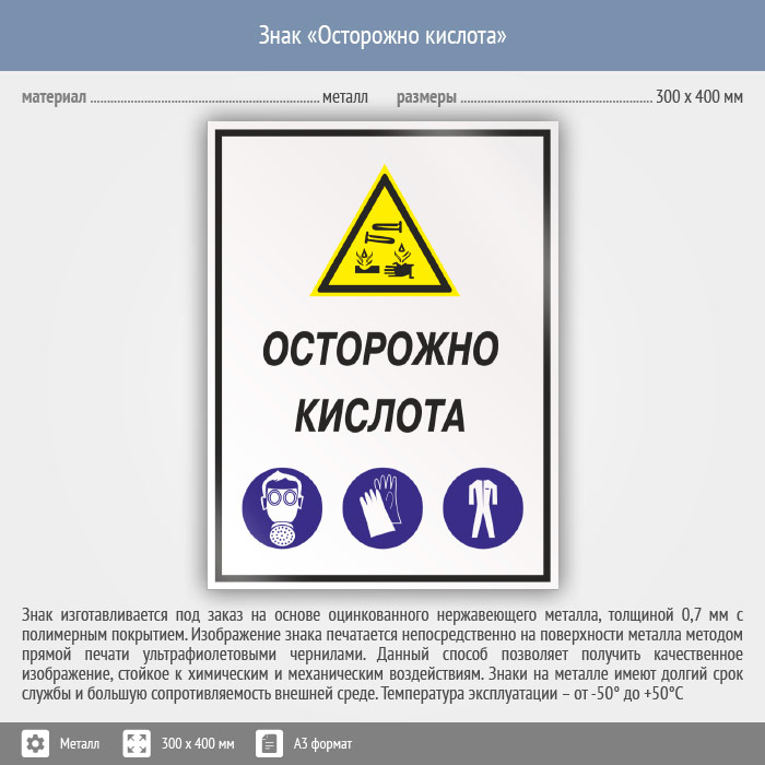 Знак «Осторожно кислота», КЗ-61 (металл, 300х400 мм) в Сургуте купить