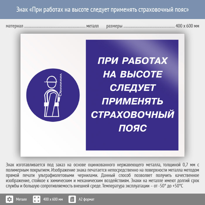 Знак «При работах на высоте следует применять страховочный пояс», КЗ-75 (металл, 600х400 мм) в Сургуте купить