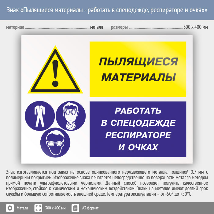 Знак «Пылящиеся материалы - работать в спецодежде, респираторе и очках», КЗ-79 (металл, 400х300 мм) в Сургуте купить