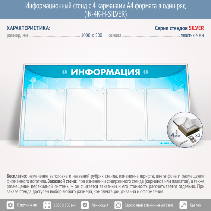 Информационный стенд с 4 карманами А4 формата в один ряд (IN-4K-H-SILVER) в Сургуте купить