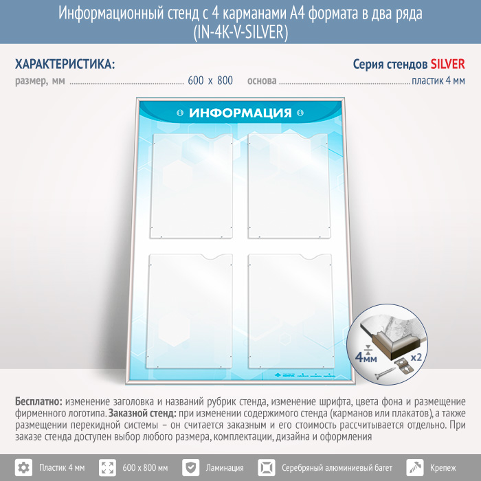 Информационный стенд с 4 карманами А4 формата в два ряда (IN-4K-V-SILVER) в Сургуте купить