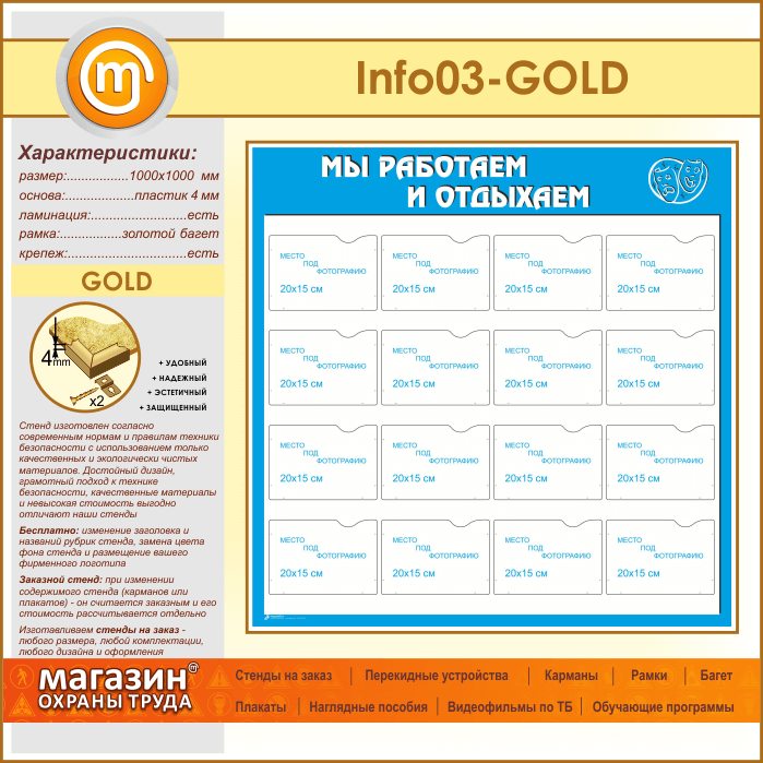 Стенд «Мы работаем и отдыхаем» с 16 карманами А5 формата (IN-03-GOLD) в Сургуте купить