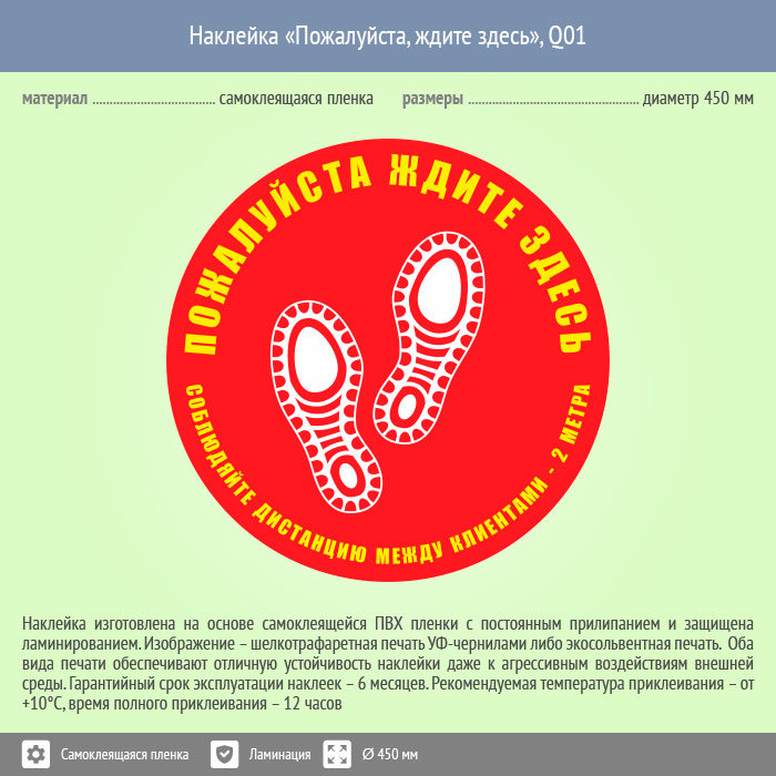 Наклейка на пол «Пожалуйста, ждите здесь», Q01 (пленка c ламинированием, диаметр 450 мм) в Сургуте купить