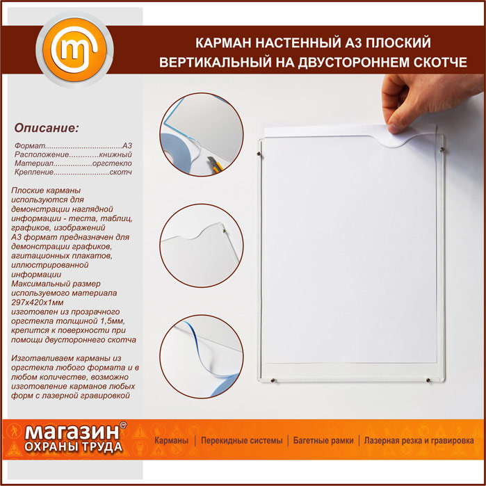 Карман настенный А3 плоский вертикальный на двустороннем скотче в Сургуте купить