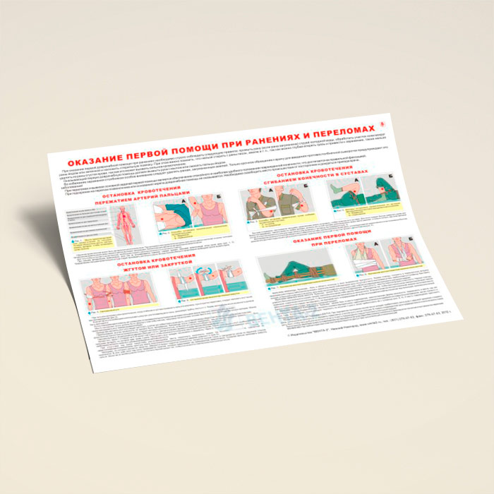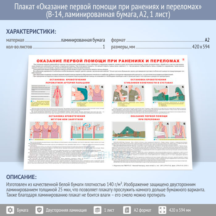 Плакат «Оказание первой помощи при ранениях и переломах» (В-14, ламинированная бумага, А2, 1 лист) в Сургуте купить