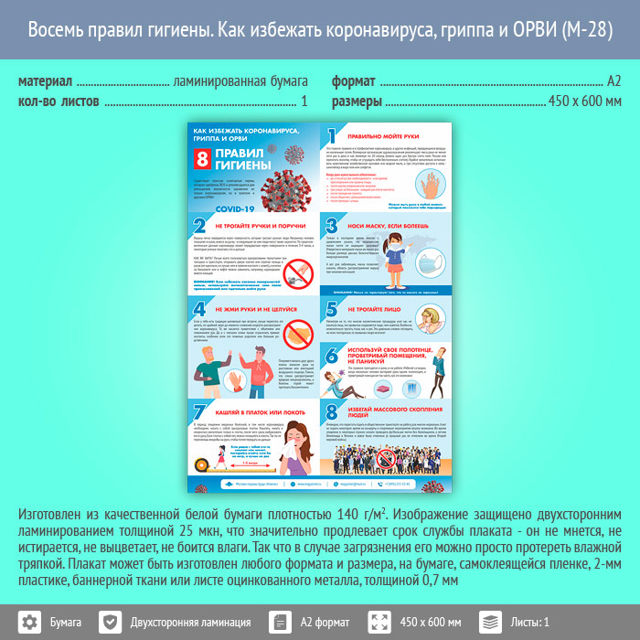 Плакат «Восемь правил гигиены. Как избежать коронавируса, гриппа и ОРВИ» (М-28, ламинированная бумага, А2, 1 лист) в Сургуте купить