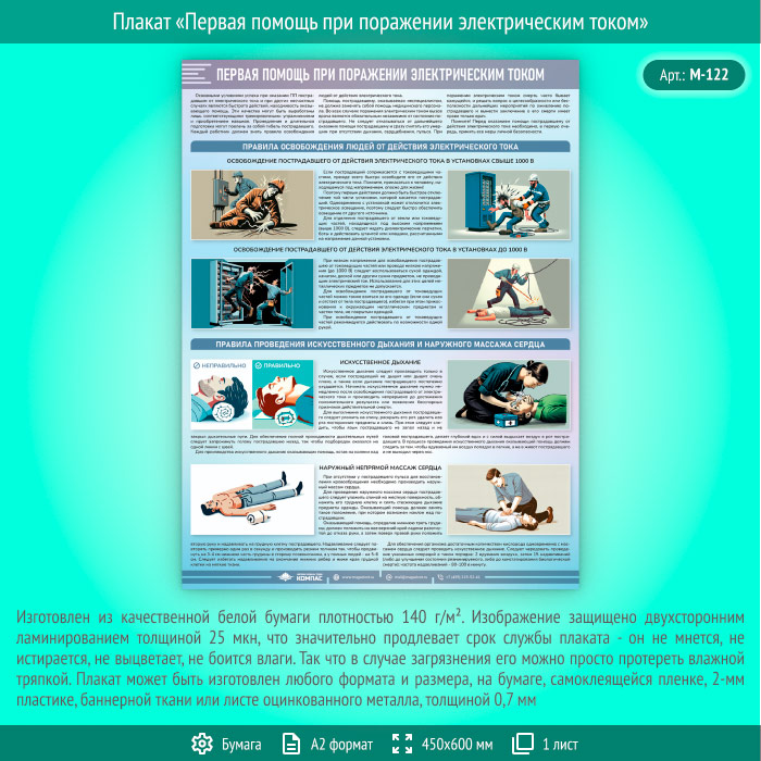 Плакат «Первая помощь при поражении электрическим током» (М-122, ламинированная бумага, А2, 1 лист) в Сургуте купить