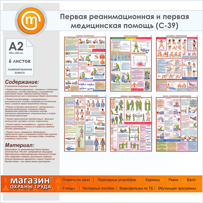 Плакат «Оказание первой помощи пострадавшим» (С-39, ламинированная бумага, А2, 6 листов) в Сургуте купить