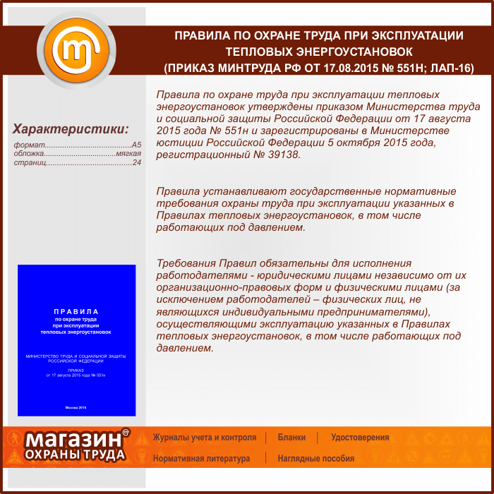 Правила по охране труда при эксплуатации тепловых энергоустановок (Приказ Минтруда РФ от 17.08.2015 № 551н) (ЛАП-16) в Сургуте купить