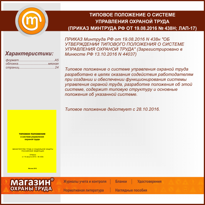 Типовое положение о системе управления охраной труда (Приказ Минтруда РФ от 19.08.2016 № 438н) (ЛАП-17) в Сургуте купить