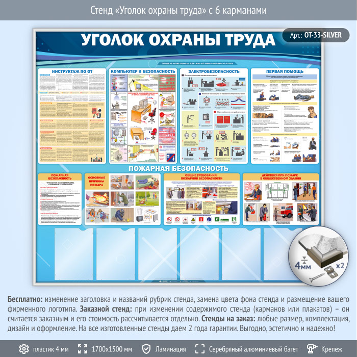 Стенд «Уголок охраны труда» с 6 карманами (OT-33-SILVER) в Сургуте купить