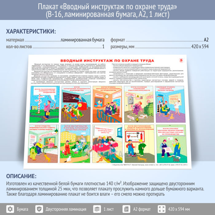 Плакат «Вводный инструктаж по охране труда» (В-16, ламинированная бумага, А2, 1 лист) в Сургуте купить