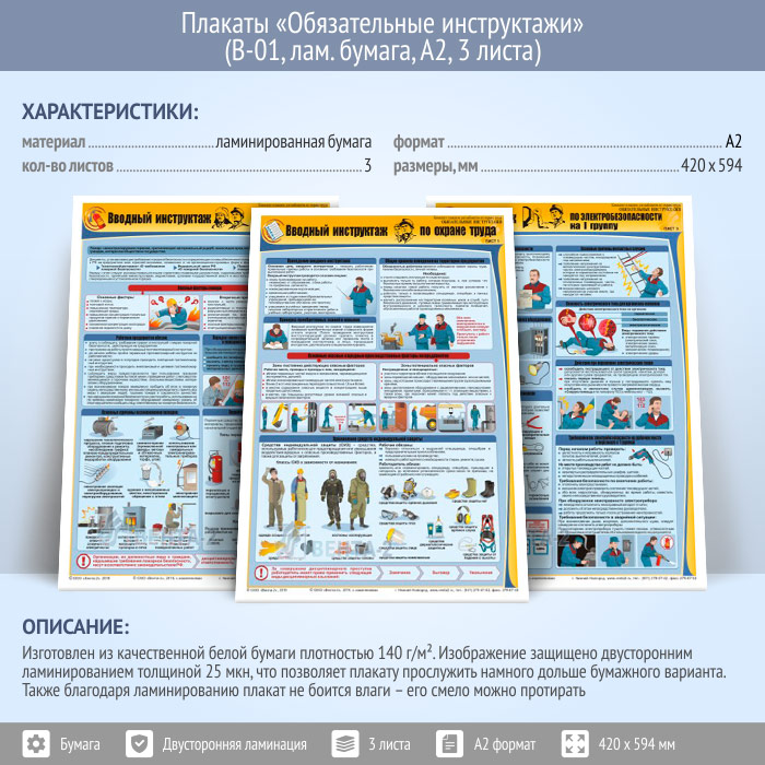 Плакаты «Обязательные инструктажи» (вводный инструктаж, вводный противопожарный инструктаж, инструктаж на I группу по электробезопасности) (В-01, ламинированная бумага, А2, 3 листа) в Сургуте купить
