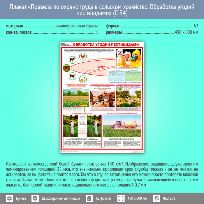 Плакат «Правила по охране труда в сельском хозяйстве. Обработка угодий пестицидами» (С-94, ламинированная бумага, А2, 1 лист) в Сургуте купить