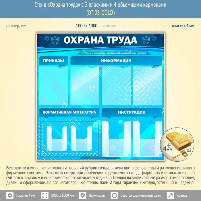 Стенд «Охрана труда» с 4 плоскими и 4 объемными карманами (OT-03-GOLD) в Сургуте купить