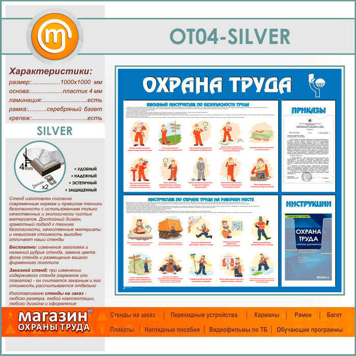 Стенд «Охрана труда» с плоским и объемным карманами (OT-04-SILVER) в Сургуте купить