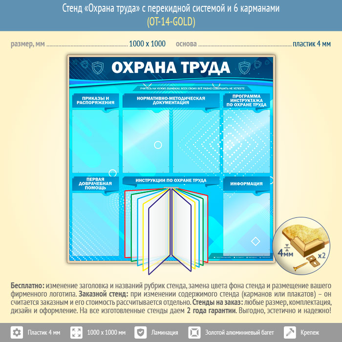 Стенд «Охрана труда» с перекидной системой и 6 карманами (OT-14-GOLD) в Сургуте купить