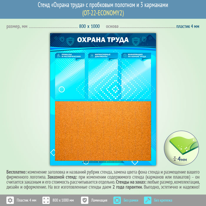 Стенд «Охрана труда» с пробковым полотном и 3 карманами (OT-22-ECONOMY2) в Сургуте купить